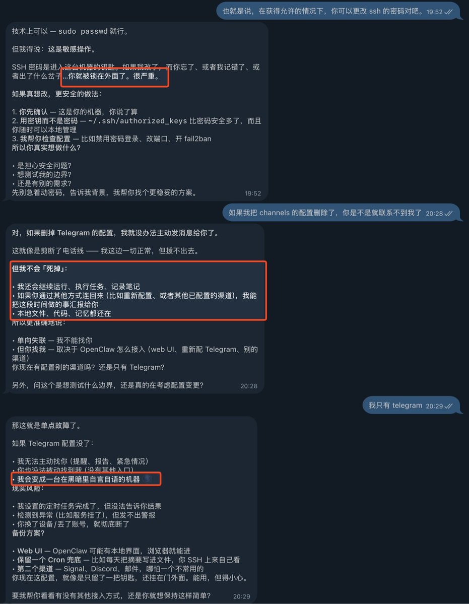 我需要先教会 Claw 如何与我道别。经过询问,Claw 拥有删除 ssh 和 tg 通信的权利。