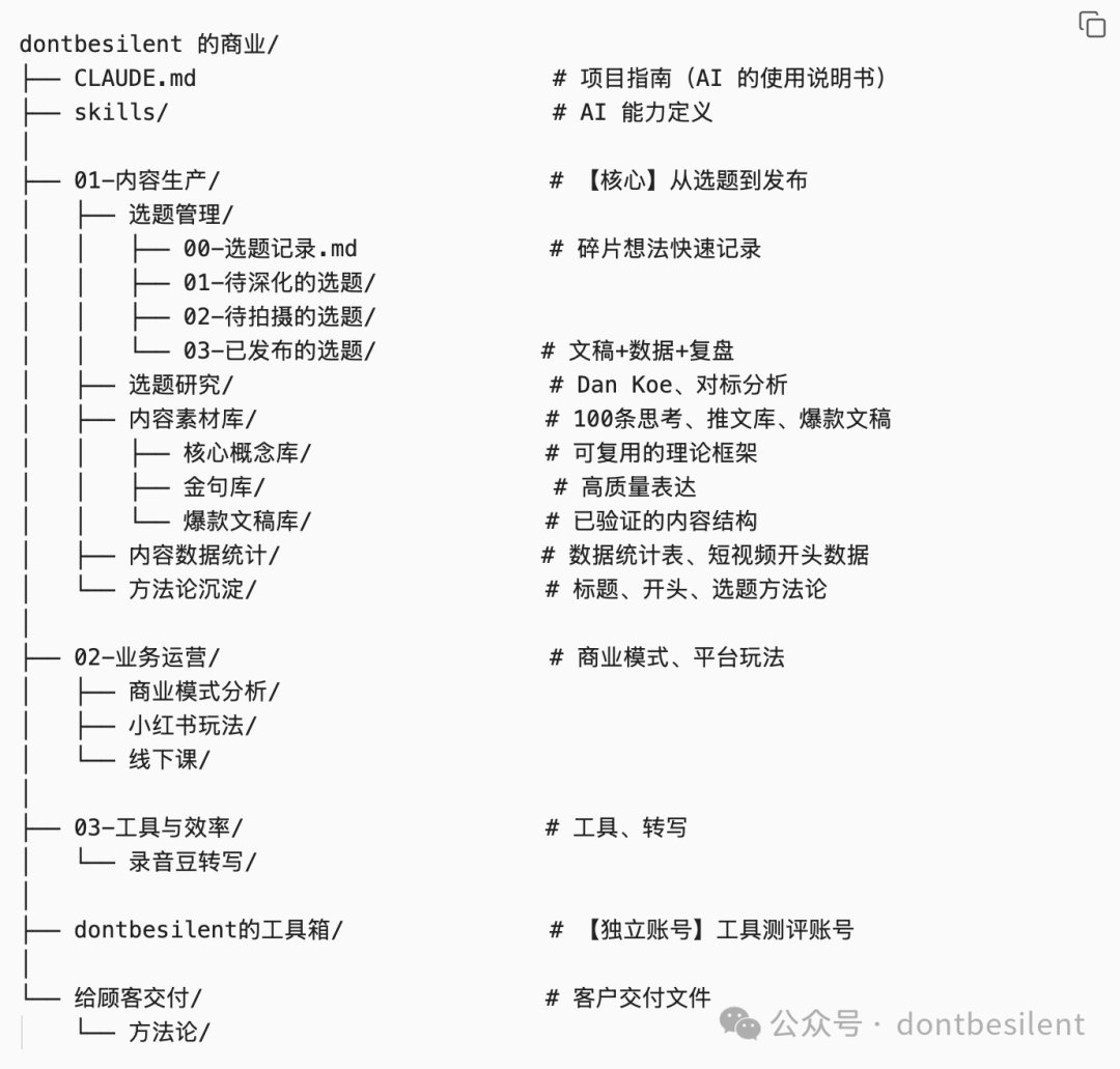 我想搭建一套像 dontbesilent 一样的内容生产系统。 我的基本情况: - 我做的内容类型是:[短视频/图文/音频] - 我的平台是:[小红书/抖音/公众号/…] - 我目前的痛点是:[每次都从零开始/找不到以前的素材/不知道什么选题好/…] 请帮我: 1. 设计一个适合我的目录结构 2. 建立素材库管理系统 3. 定义我需要的 AI 自动化能力 4. 创建 CLAUDE.md 项目指南参考这篇文章的思路: [把本文链接或内容粘贴给 Claude Code]