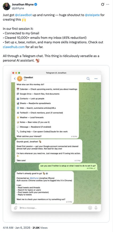 Normal AI: “You should check these 10 sources for market news” Clawdbot: Already scraped them, summarized them, and texted you the key points