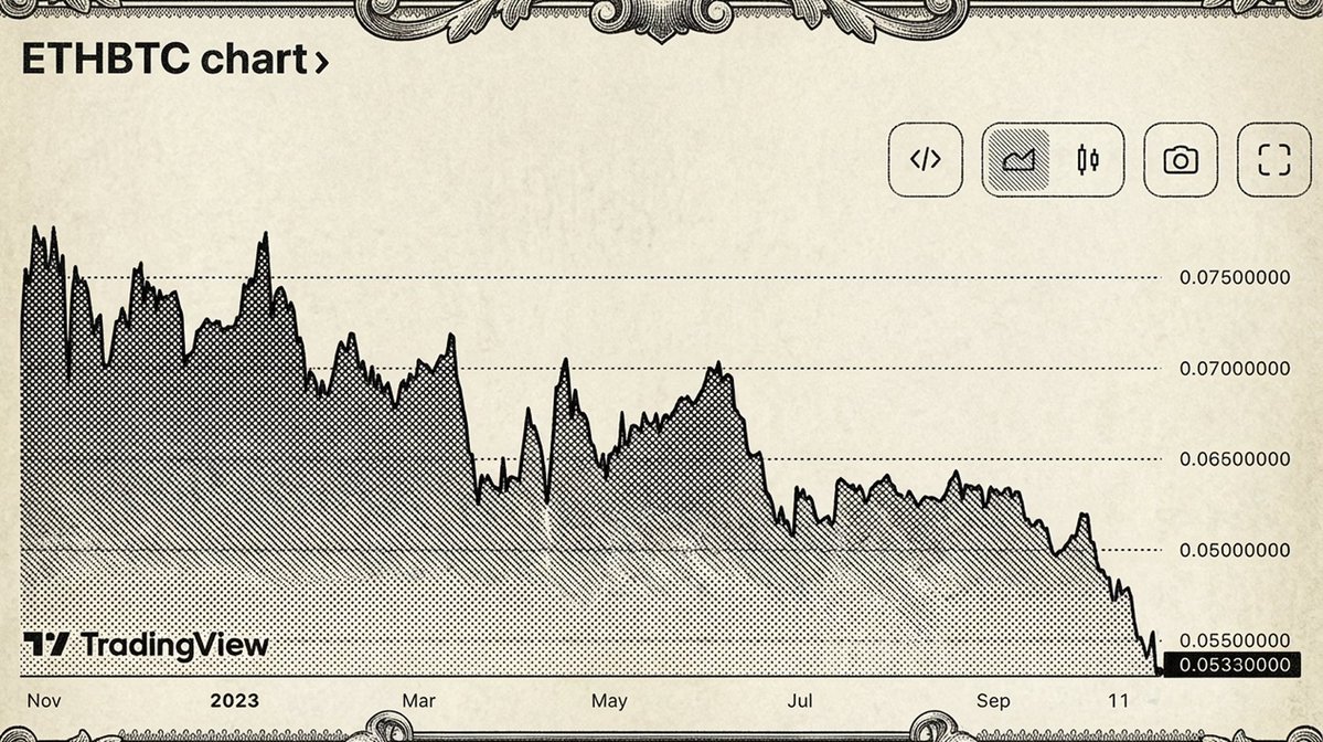 过去一年,以太坊跟比特币的汇率就是最完美的陷阱,每根红线下面都是一堆尸骨。