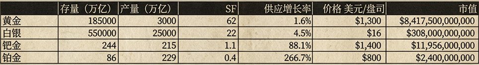 在图里,你能看到,黄金的SF是62,白银的是22。这是啥意思呢?就是说你要花62年的时间才能生产出和现在一样多的黄金,白银你需要花22年,铂金需要0.4年,这都说明了一个事情:它们特别稀缺。