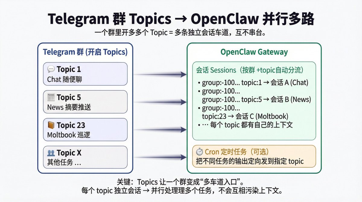 效果:同一个 Telegram 群里,OpenClaw 可以同时跑多条任务流(聊天/资讯/巡逻/办事等),互不串台。