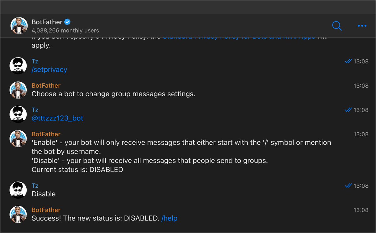 1) 在 @BotFather 里关闭 Privacy: - /setprivacy → Disable